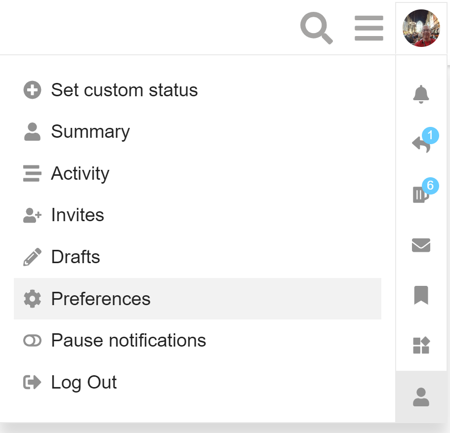 You can choose to receive notifications by email when other people reply to you, message you, or mention you in a post – just click on your profile at top right, then click the silhouette and select Preferences, as shown below: