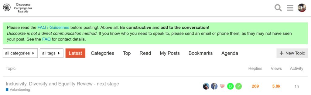Discourse is CAMRA’s web forum, where members can discuss anything CAMRA-related, including beer, brewery and pub news, beer festivals, CAMRA policy etc etc, or just chat in general.